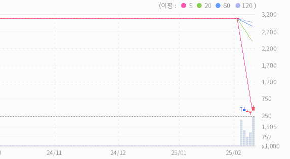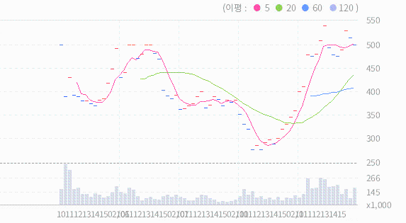 120일선과 240일선과 480일선이 역배열을 이루어 있어 장기적인 추세가 불확실하고 불안정한 상태에 있다는 신호입니다.