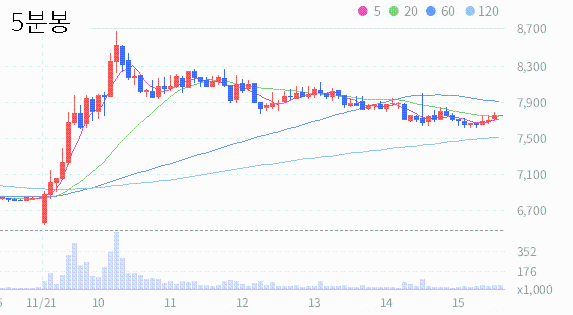 120일선과 240일선과 480일선이 역배열을 이루어 있어 장기적인 추세가 불확실하고 불안정한 상태에 있다는 신호입니다.