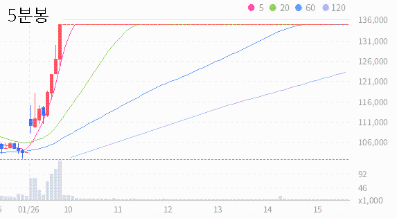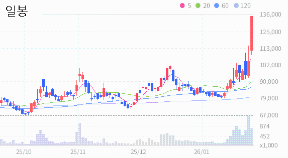 유일로보틱스의 2026.01.26 기준(KRX 장마감)현재 주가는 135000원이며, 이는 전일 종가인 103900원보다 31100원 상승한 결과를 보여주고 있습니다.