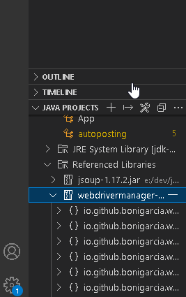 vscode에서 왼쪽하단의 레퍼런스 라이브러리에서 다운받은 웹드라이버 추가한다.