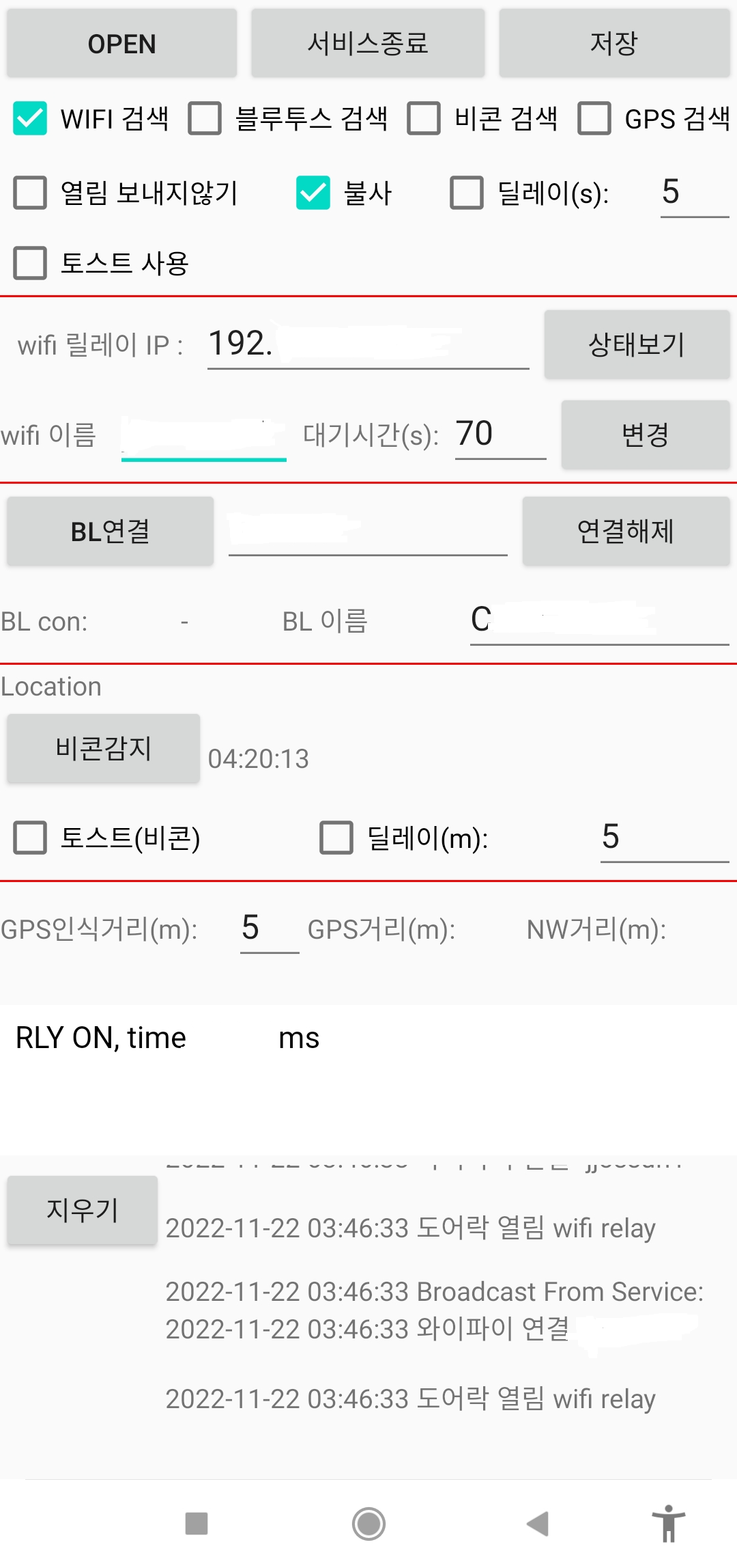 이전에는 아두이노에 블루투스와 릴레이를 연결해서 스마트폰이 블루투스에 연결되면 문이 열리게 만들었는데 스마트폰 블루투스가 현관에 설치된 제어기의 블루투스 를 계속 탐지하느라 휴대폰 배터리가 남아나질않고 연결도 깔끔하지 않아 포기하고 집 근처에 와서 wifi 접속되면 문이 열리게 방식을 바꿈