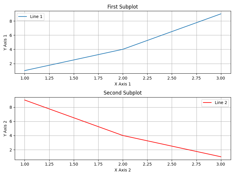 위쪽 서브플롯에 'First Subplot'이라는 제목의 선 그래프가 그려지고, 아래쪽 서브플롯에 'Second Subplot'이라는 제목의 선 그래프가 그려집니다. tight_layout() 함수로 간격이 자동으로 조정됩니다.