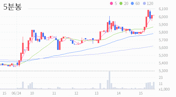 최근 5일 종가들의 평균은 5572원입니다.