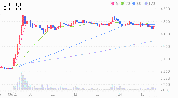 대원전선의 2024.06.26 기준(장마감)현재 주가는 4265원이며, 이는 전일 종가인 3540원보다 725원 상승한 결과를 보여주고 있습니다.
