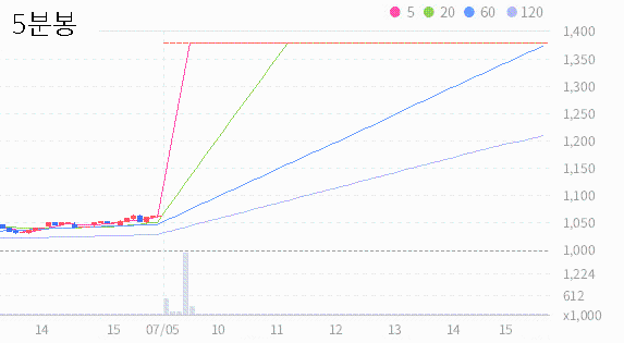 오늘 종가와 20일 이동평균선 사이의 이격도가 145%이므로 약세장이 아닌 경우 20일 이동평균선과의 이격도 상에서는 매도 신호로 볼 수있습니다.