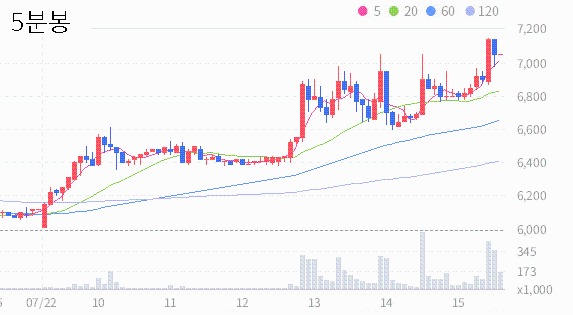 희림의 2024.07.22 기준(장마감)현재 주가는 7150원이며, 이는 전일 종가인 6080원보다 1070원 상승한 결과를 보여주고 있습니다.