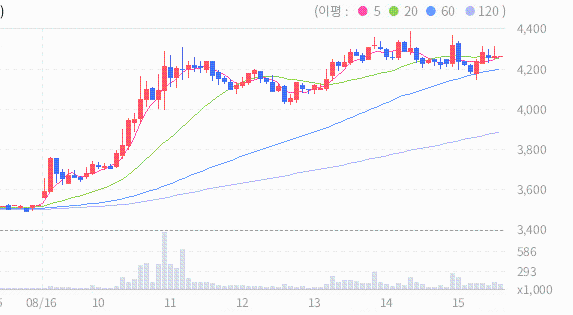 제놀루션의 종가는 4305원이며 제놀루션의 현재 주가는 장기적인 흐름을 나타내는 지표 중 하나인 240일 이동 평균선 위에 위치하고 있습니다. 이는 과거 240일 동안의 평균 주가를 나타내는 이동 평균선을 기준으로 주가가 위에 위치하고 있음을 의미합니다. 이러한 상황은 장기적인 관점에서 주가가 상승 추세에 있을 수 있다는 긍정적인 신호로 해석될 수 있습니다.