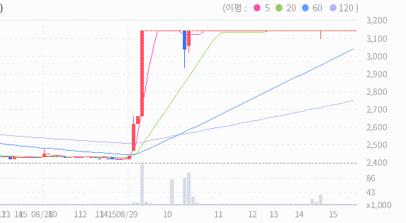 오늘 종가와 20일 이동평균선 사이의 이격도가 139%이므로 약세장이 아닌 경우 20일 이동평균선과의 이격도 상에서는 매도 신호로 볼 수있습니다.