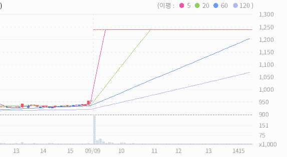 오늘 종가와 20일 이동평균선 사이의 이격도가 151%이므로 약세장이 아닌 경우 20일 이동평균선과의 이격도 상에서는 매도 신호로 볼 수있습니다.