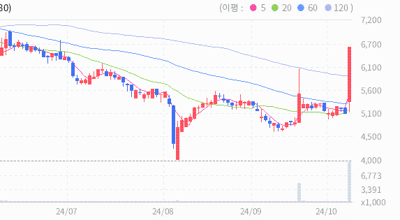 컴퍼니케이의 2024.10.11 기준(장마감)현재 주가는 6590원이며, 이는 전일 종가인 5070원보다 1520원 상승한 결과를 보여주고 있습니다.