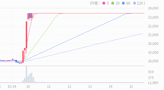 오늘 종가와 20일 이동평균선 사이의 이격도가 154%이므로 약세장이 아닌 경우 20일 이동평균선과의 이격도 상에서는 매도 신호로 볼 수있습니다.