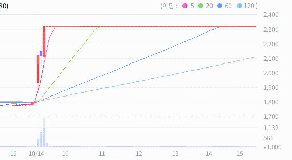 오늘 종가와 20일 이동평균선 사이의 이격도가 145%이므로 약세장이 아닌 경우 20일 이동평균선과의 이격도 상에서는 매도 신호로 볼 수있습니다.