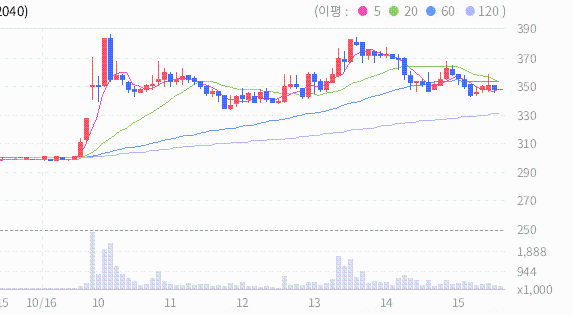 케이피엠테크의 종가는 348원이며 케이피엠테크의 현재 주가는 장기적인 흐름을 나타내는 지표 중 하나인 240일 이동 평균선 위에 위치하고 있습니다. 이는 과거 240일 동안의 평균 주가를 나타내는 이동 평균선을 기준으로 주가가 위에 위치하고 있음을 의미합니다. 이러한 상황은 장기적인 관점에서 주가가 상승 추세에 있을 수 있다는 긍정적인 신호로 해석될 수 있습니다.