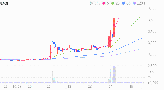 오늘 종가와 20일 이동평균선 사이의 이격도가 141%이므로 약세장이 아닌 경우 20일 이동평균선과의 이격도 상에서는 매도 신호로 볼 수있습니다.