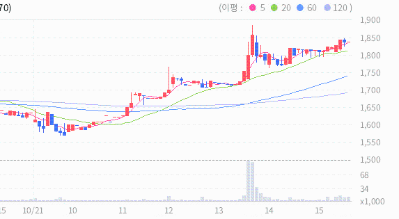 오늘 종가와 20일 이동평균선 사이의 이격도가 115%이므로 약세장이 아닌 경우 20일 이동평균선과의 이격도 상에서는 매도 신호로 볼 수있습니다.