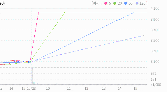 오늘 종가와 20일 이동평균선 사이의 이격도가 145%이므로 약세장이 아닌 경우 20일 이동평균선과의 이격도 상에서는 매도 신호로 볼 수있습니다.