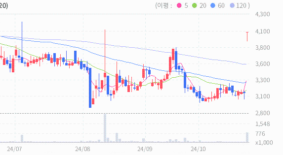제노포커스의 2024.10.28 기준(장마감)현재 주가는 4035원이며, 이는 전일 종가인 3105원보다 930원 상승한 결과를 보여주고 있습니다.