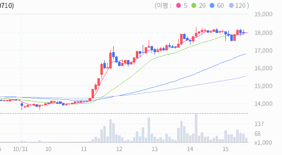 오늘 종가와 20일 이동평균선 사이의 이격도가 122%이므로 약세장이 아닌 경우 20일 이동평균선과의 이격도 상에서는 매도 신호로 볼 수있습니다.