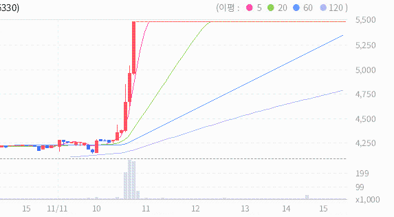 오늘 종가와 20일 이동평균선 사이의 이격도가 151%이므로 약세장이 아닌 경우 20일 이동평균선과의 이격도 상에서는 매도 신호로 볼 수있습니다.