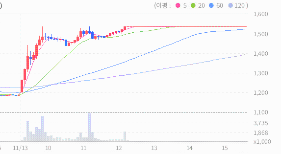 휴림로봇의 2024.11.13 기준(장마감)현재 주가는 1539원이며, 이는 전일 종가인 1184원보다 355원 상승한 결과를 보여주고 있습니다.