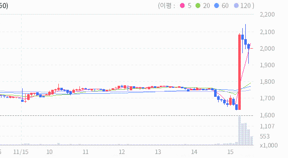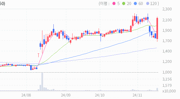 국영지앤엠의 2024.11.15 기준(장마감)현재 주가는 2120원이며, 이는 전일 종가인 1702원보다 418원 상승한 결과를 보여주고 있습니다.