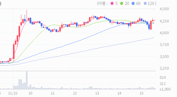 120일선과 240일선과 480일선이 역배열을 이루어 있어 장기적인 추세가 불확실하고 불안정한 상태에 있다는 신호입니다.