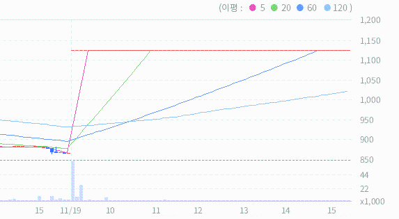 오늘 종가와 20일 이동평균선 사이의 이격도가 119%이므로 약세장이 아닌 경우 20일 이동평균선과의 이격도 상에서는 매도 신호로 볼 수있습니다.