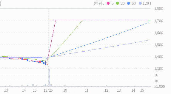 오늘 종가와 20일 이동평균선 사이의 이격도가 131%이므로 약세장이 아닌 경우 20일 이동평균선과의 이격도 상에서는 매도 신호로 볼 수있습니다.