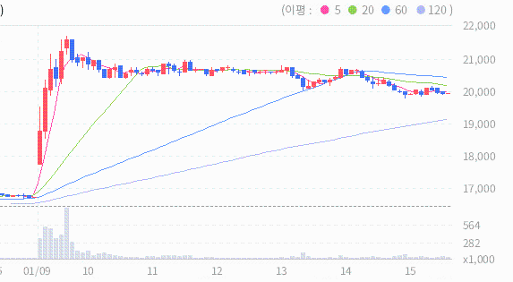 오늘 종가와 20일 이동평균선 사이의 이격도가 156%이므로 약세장이 아닌 경우 20일 이동평균선과의 이격도 상에서는 매도 신호로 볼 수있습니다.