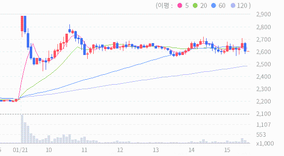 예림당의 종가는 2600원이며 예림당의 현재 주가는 장기적인 흐름을 나타내는 지표 중 하나인 240일 이동 평균선 위에 위치하고 있습니다. 이는 과거 240일 동안의 평균 주가를 나타내는 이동 평균선을 기준으로 주가가 위에 위치하고 있음을 의미합니다. 이러한 상황은 장기적인 관점에서 주가가 상승 추세에 있을 수 있다는 긍정적인 신호로 해석될 수 있습니다.